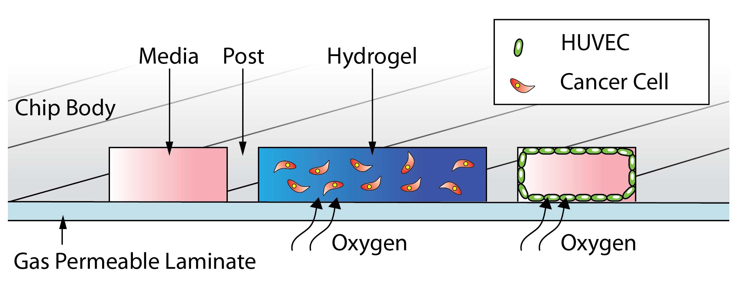水凝膠貫穿在整個(gè)AIM芯片的間隙中,流體及化學(xué)物濃度梯度都可以被控制和調(diào)節(jié)。